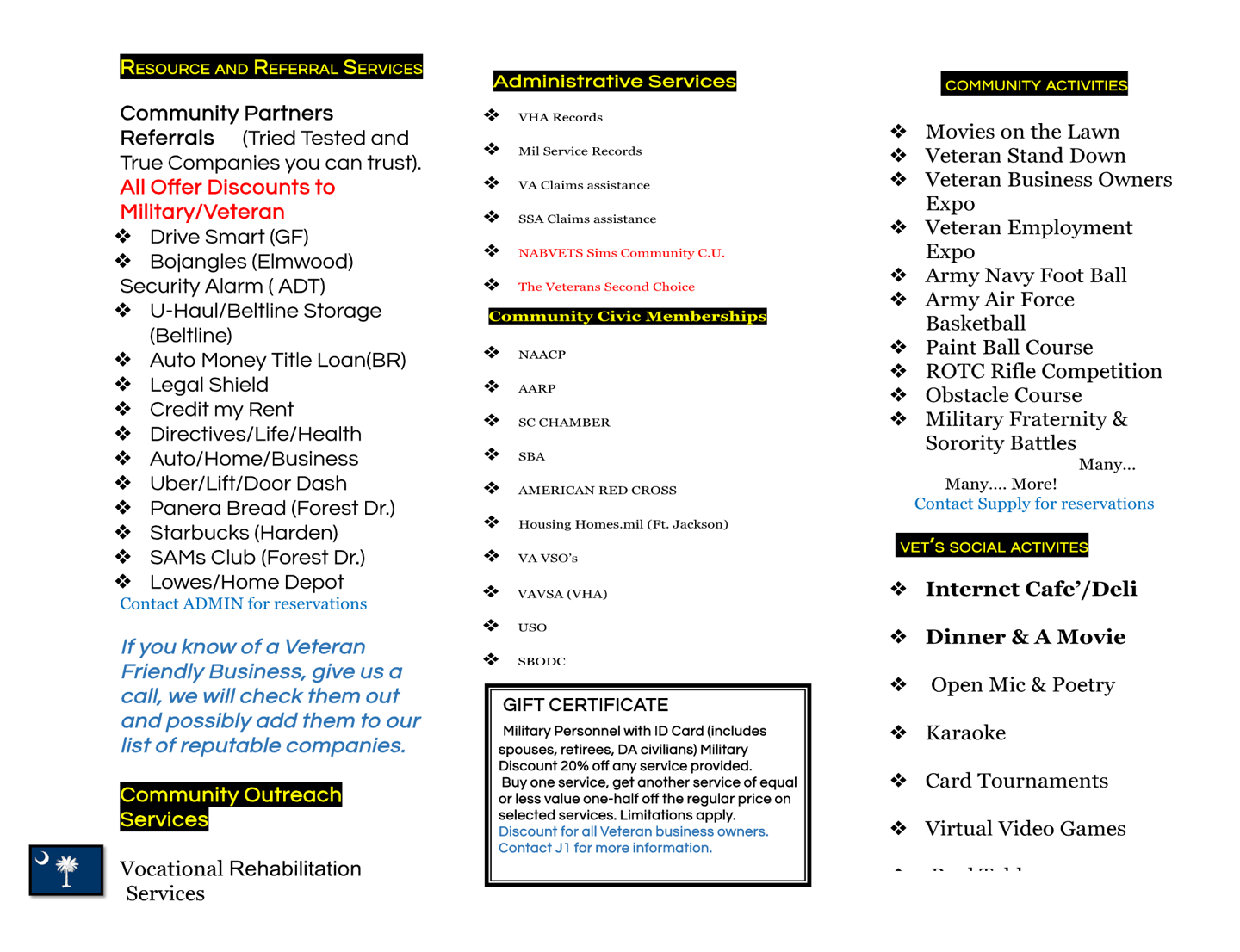 Providing essential services for servicemen/women, veterans, and their families in SC.